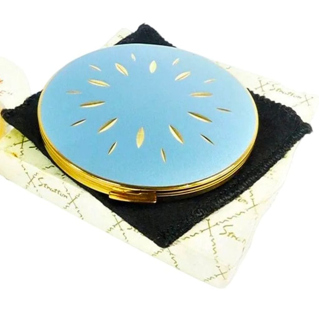 A gorgeous unused powder blue enamel Stratton Slim Convertible compact. The high quality enamel lid is embellished with diamond cut gilt accents which gleam in the light. The original presentation box, felt pouch, instruction leaflet, inspection docket, puff and sifter are present. All clasps & hinges work perfectly. The mirror gives a good accurate reflection. Super condition! No loss of enamel or fading.
