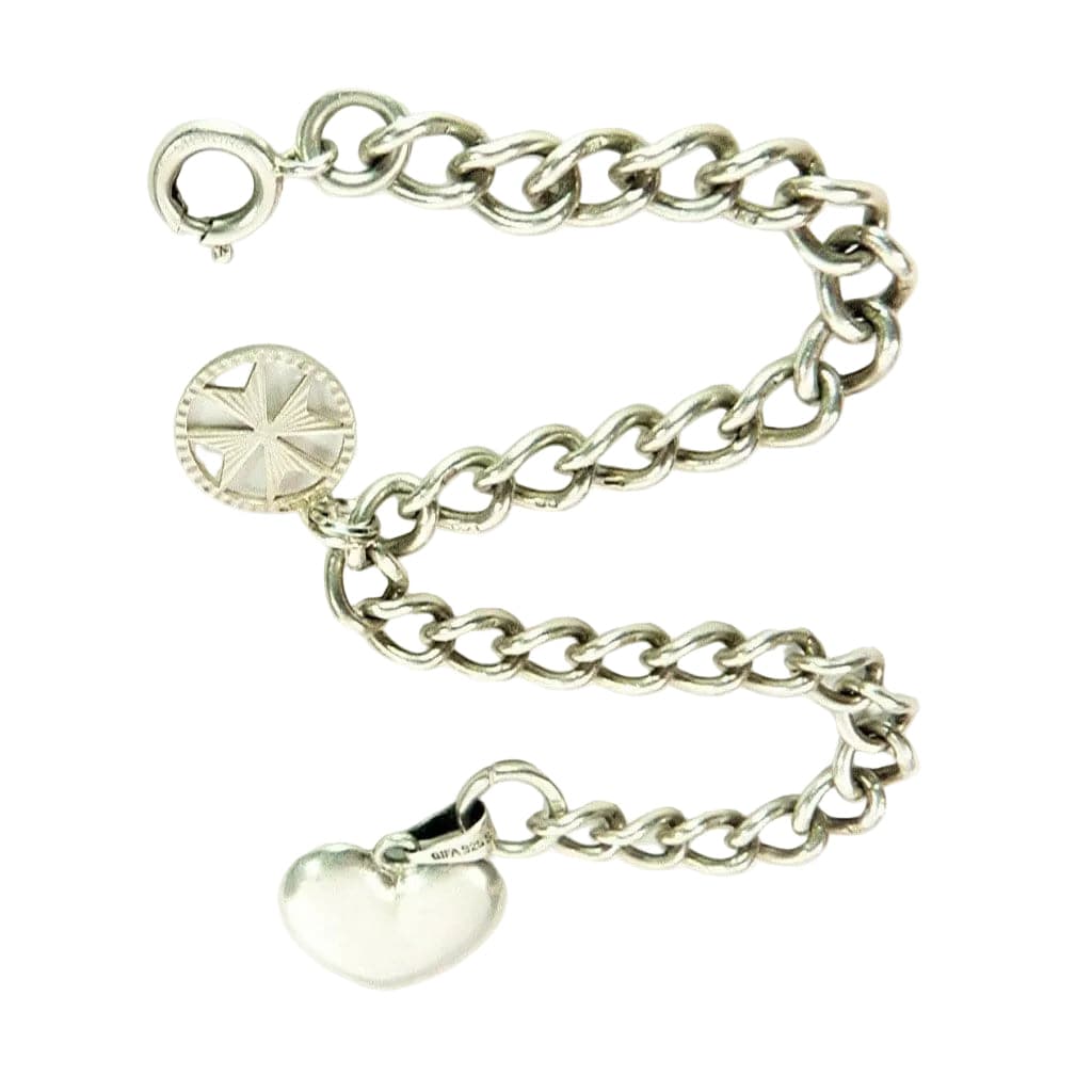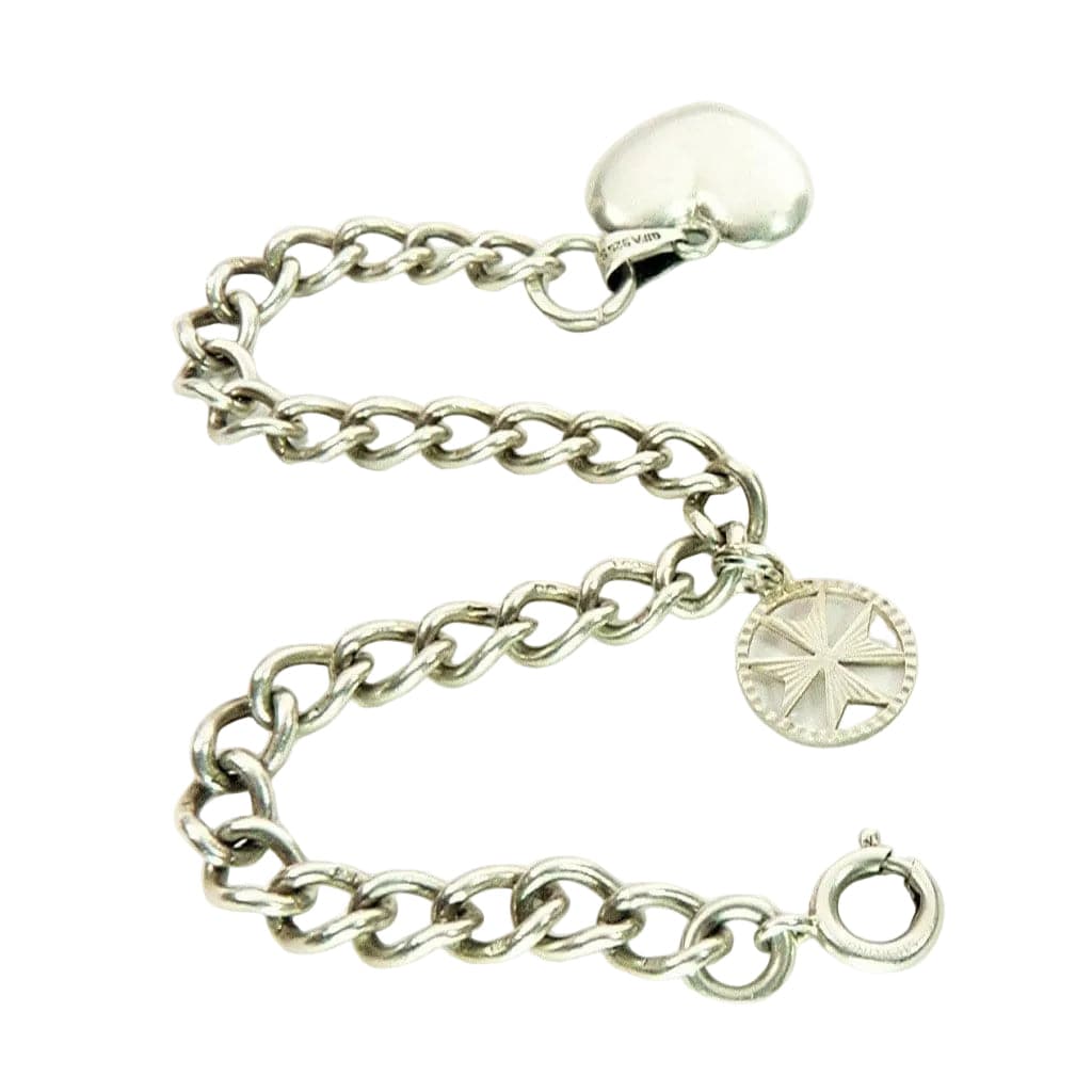 A gleaming fully hallmarked vintage sterling silver curb bracelet with sterling silver heart and Maltese Cross lucky charms.