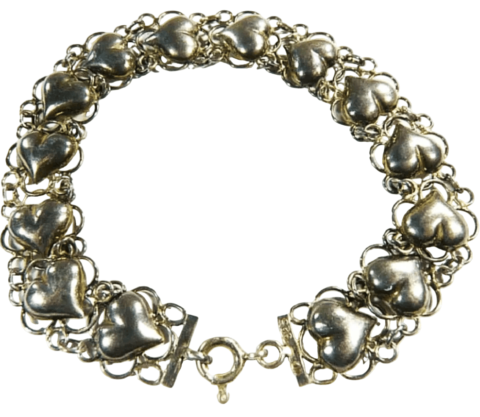 An enchanting mid-century hallmarked sterling silver heart charm bracelet. This elegant solid silver bracelet has the most beautiful very dark patina.