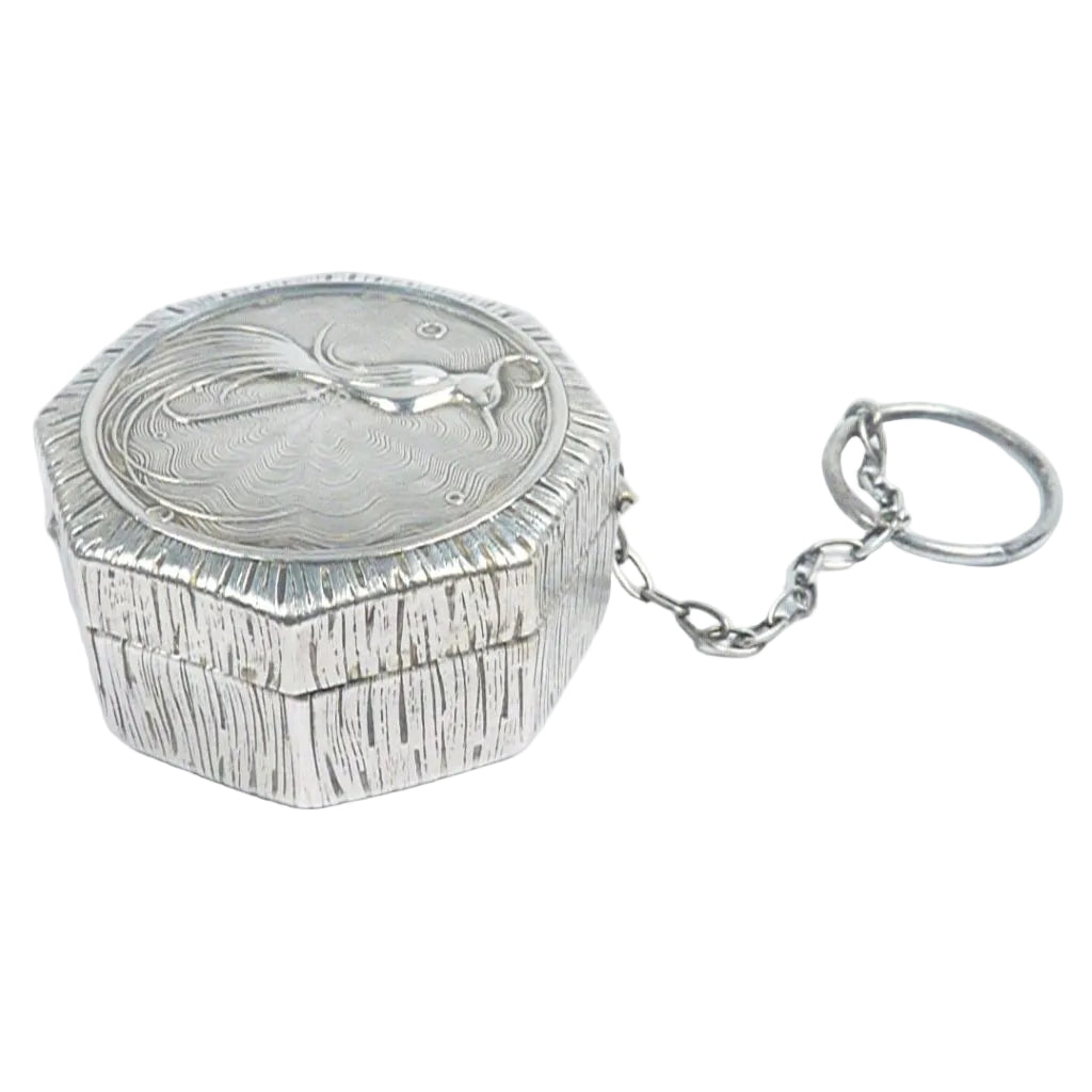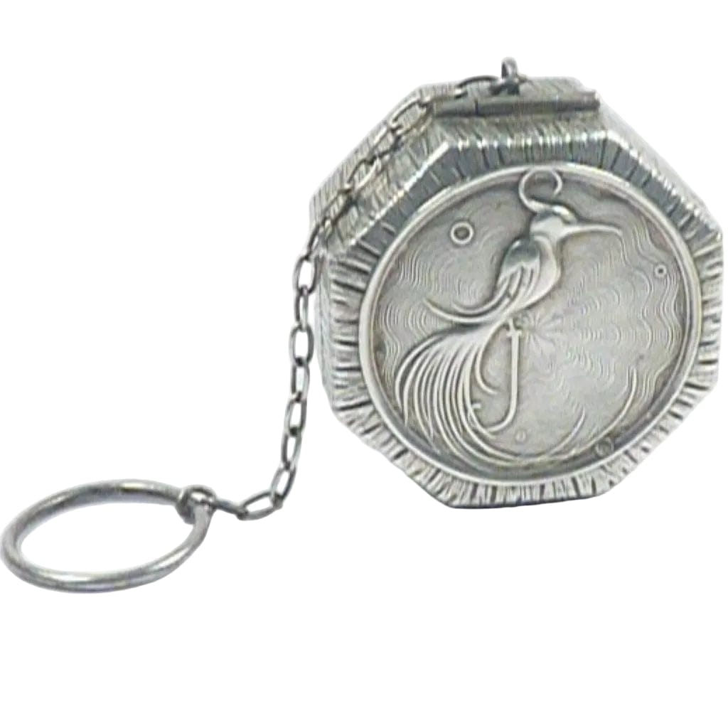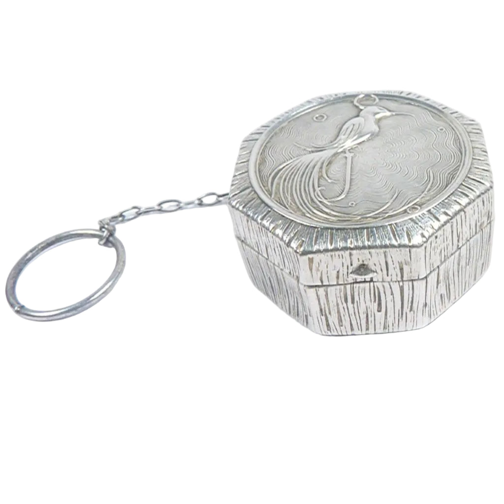 The lid features a bird of paradise in low relief perching on the letter J.