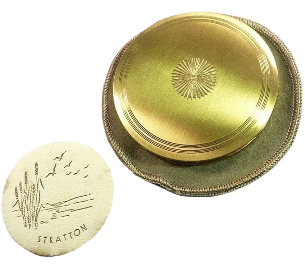 The first thing that drew our attention to this mid-century signed Stratton vanity was the delightful and rare puff. Then we realized that the compact was far from ordinary. It is an unused and early prototype 'Scone' model. The dimensions are those that you would expect for the 'Scone' but open the compact and there the similarities end.