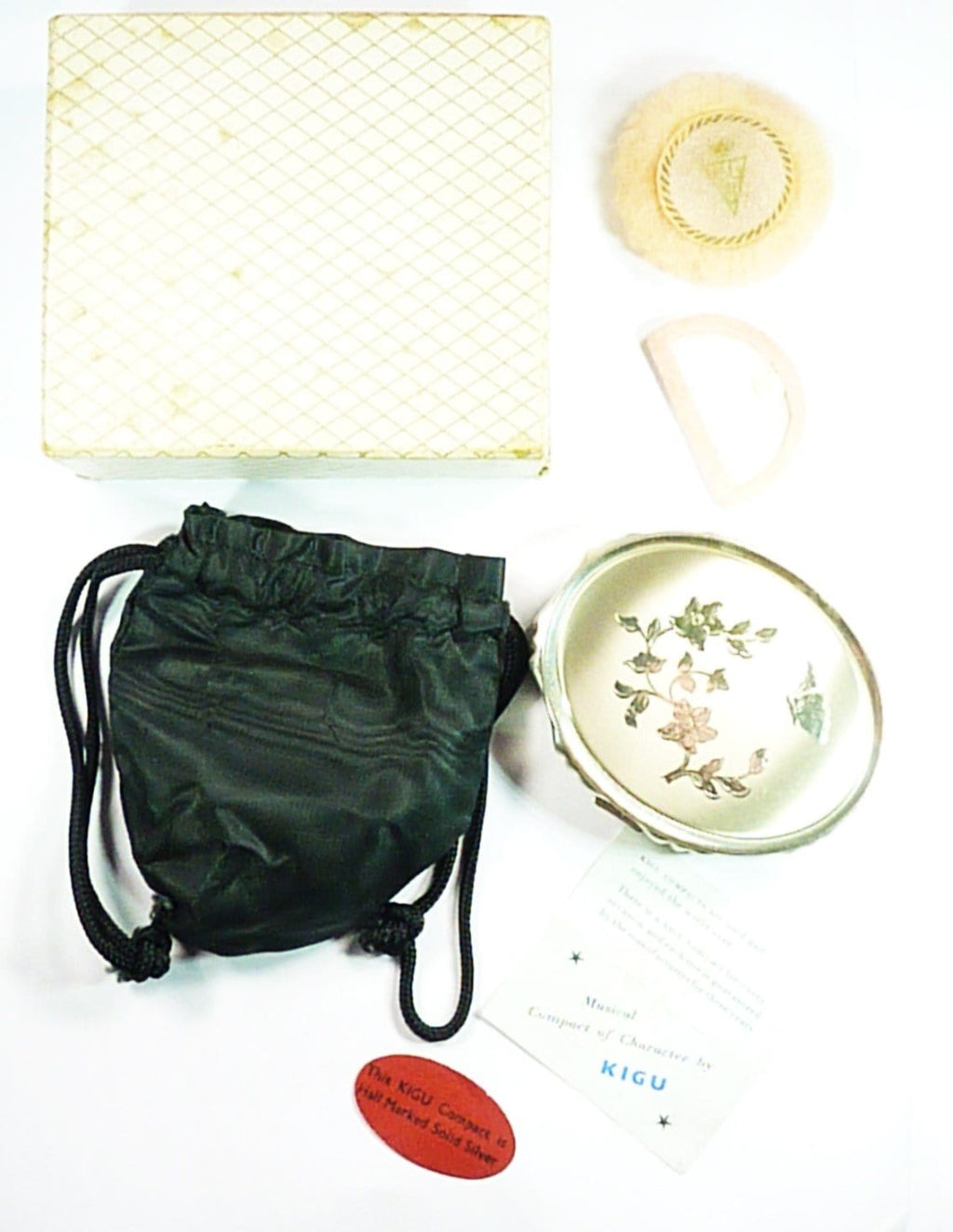 A very beautiful rare 1959 sterling silver Kigu musical powder box with the original presentation box, instruction leaflet, docket, unused puff & sifter together with a black draw string pouch.