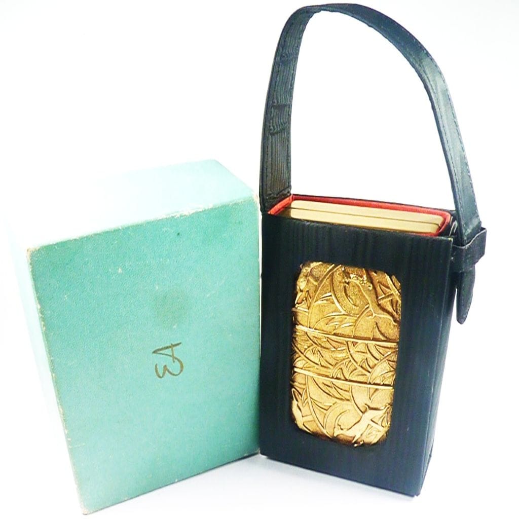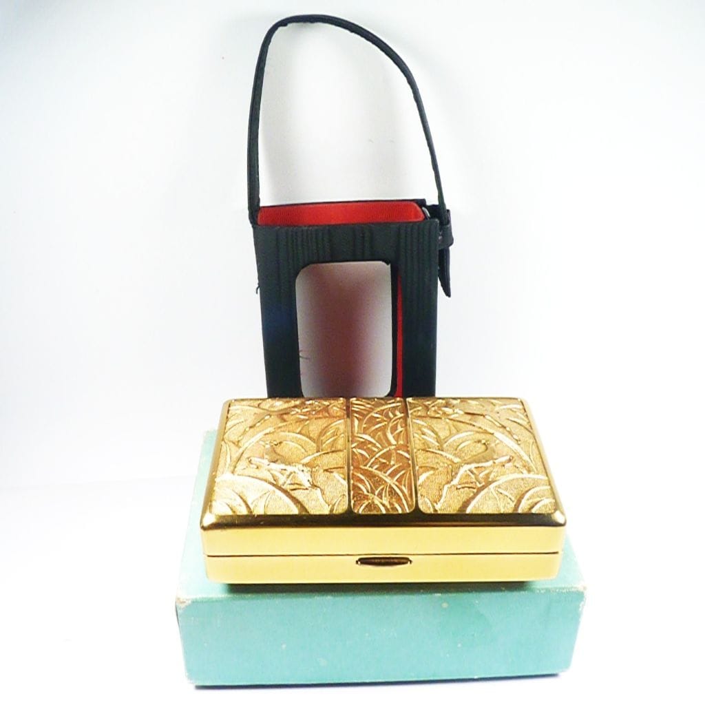 This highly collectible vanity is presented in the original box, with the original black moiré carrying case, lipstick tube, puff and sifter - all in good order.
