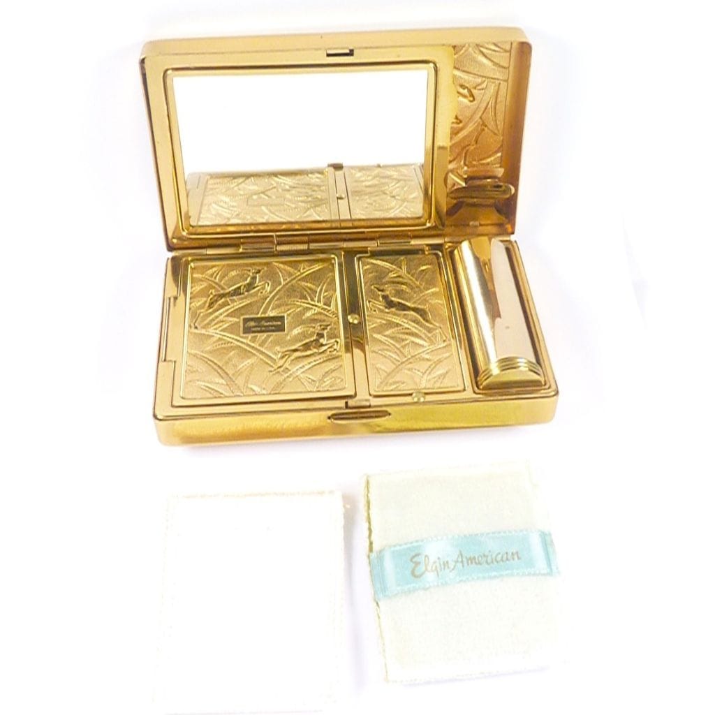 Such an iconic vintage Elgin American Carryall which is embellished with embossed leaping gazelles and ferns on the outer and interior case.