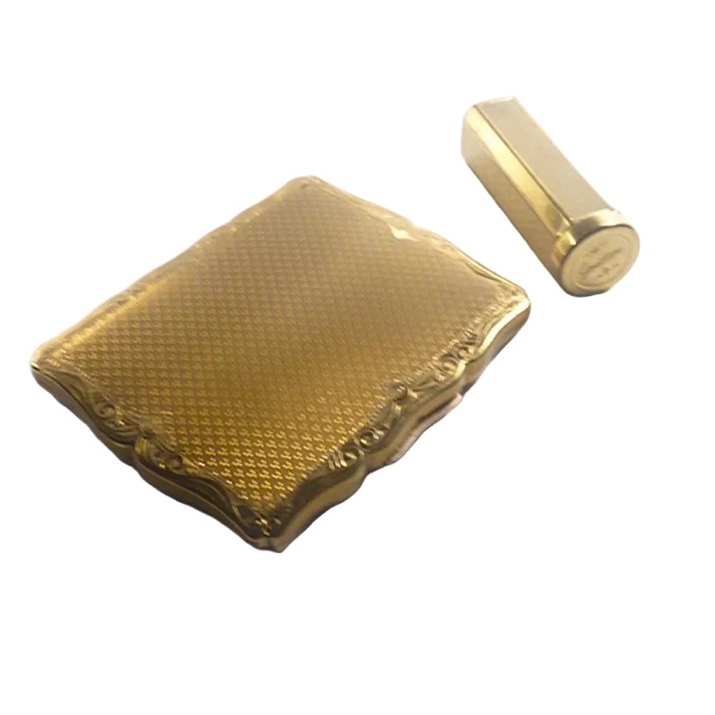 The Stratton Empress powder compact mirror and matching lipstick holder are decorated with gorgeous hand engine turned designs.